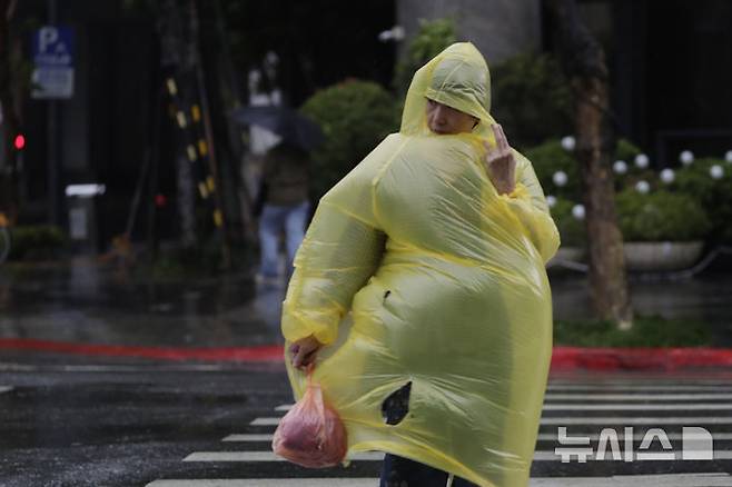 [타이베이=AP/뉴시스] 31일(현지시각) 대만 타이베이에서 한 여성이 입고 있는 비옷이 제21호 태풍 콩레이가 몰고 온 강풍으로 심하게 펄럭이고 있다. 2024.10.31.