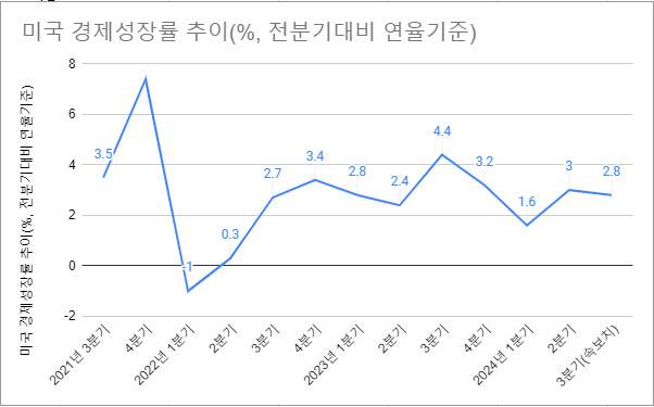 미국 상무부는 3분기(7~9월) 국내총생산(GDP) 증가율(속보치)이 연율 2.8%로 집계됐다고 30일(현지시간) 밝혔다.
