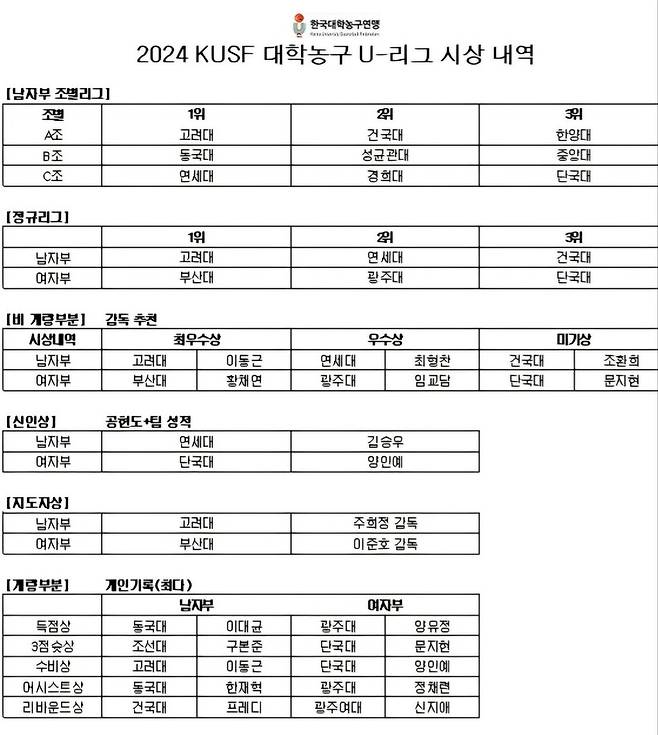 한국대학농구연맹은 31일 2024 KUSF 대학농구 U-리그 시상 내역을 발표했다. 득점상, 3점슛상, 수비상, 어시스트상, 리바운드상 계량 부분과 더불어 비계량 부분, 신인상, 지도자상 수상자를 공개했다.