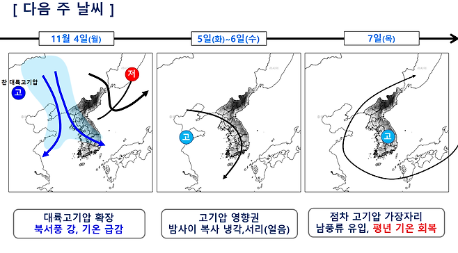 비구름이 지난 뒤 북서쪽 찬 대륙고기압이 확장하면서 기온이 큰 폭으로 떨어지겠습니다. 다음 주 화요일(5일)과 수요일(6일) 아침에는 산지와 내륙의 최저기온이 영하권으로 내려갑니다. 곳곳에 물이 얼고 서리가 내리는 곳이 많겠는데요. 그러나 다음 주 목요일(7일)에는 고기압의 가장자리에서 따뜻한 남풍이 불어오며 평년기온을 되찾겠습니다.