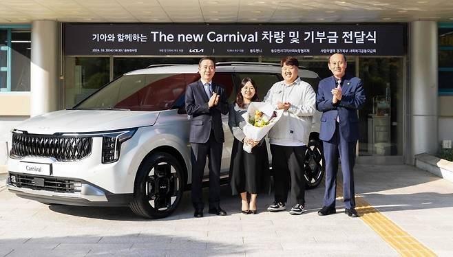 기아는 전날 경기 동두천시청에서 정원정 기아 국내사업본부장(부사장·사진 왼쪽부터)과 사공혜란 씨(30), 김준영 씨(31), 박형덕 동두천시장이 참석한 가운데 차량 전달식을 열었다.