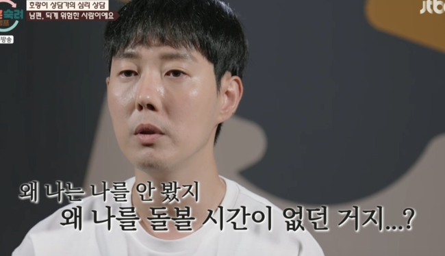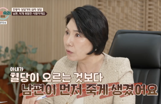 두통약을 달고 살 정도로 잠을 못 잔다고하자 상담가는 "남편이 되게 위험한 사람 표정이 없다"며 "얼굴에 고체화된 분노가 있다 참고 참다가 터진 분노였을 것"이라 추측했다.