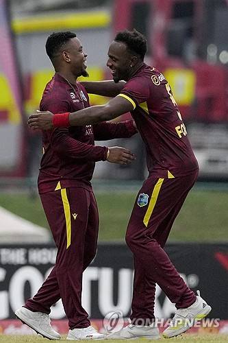 West Indies' Shimron Hetmyer, left, celebrates with Matthew Forde talking the catch to dismiss England's Sam Curran during the first ODI cricket match at Sir Vivian Richards Ground in North Sound, Antigua and Barbuda, Thursday, Oct. 31, 2024. (AP Photo/Ricardo Mazalan)