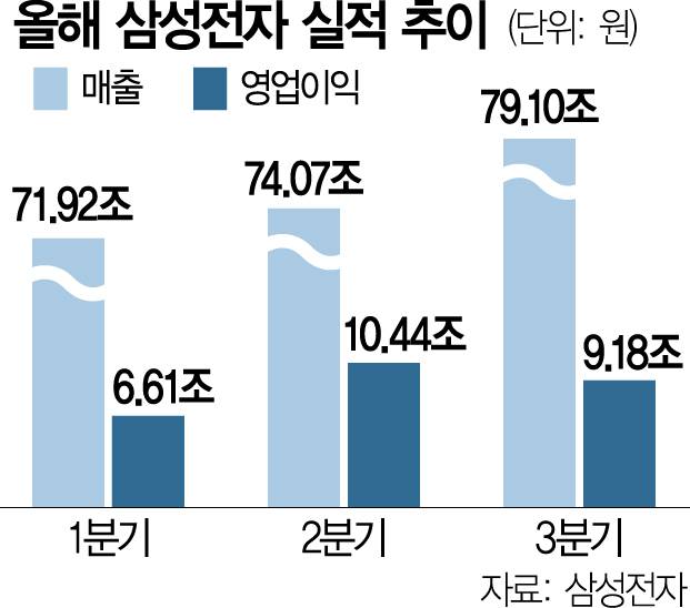 한편 삼성전자 전체 매출은 79조 1000억 원으로 사상 최대 분기 매출 기록을 갈아 치웠다. 영업이익은 9조 1800억 원을 달성했다. 3분기 연구개발(R&D) 비용 역시 분기 최대인 8조 8700억 원을 집행했으며 올해 시설투자도 사상 최대인 56조 7000억 원에 달했다.