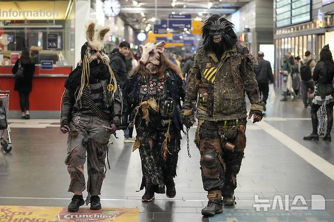 [에센=AP/뉴시스] 지난달 31일(현지시각) 독일 에센의 기차역에서 으스스한 복장을 한 사람들이 핼러윈 좀비 행진이 열리는 곳으로 향하고 있다. 2024.11.01.