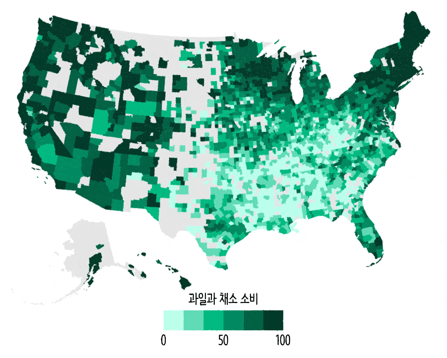 초록색 지도는 신선한 과일, 채소의 소비 정도를 나타낸 건데, 색이 진하면 진할수록 과일과 채소 식단의 비율이 높은 지역입니다. 지도에서 연한 녹색으로 표시된 곳을 주목해 볼까요? 이 지역에 속한 주는 1인당 GDP가 미국에서 가장 낮은 동네들입니다. 녹색 지도에서는 연하게 표시되었지만, 붉은색으로 표시된 지도는 색이 진하게 표시되어 있죠? 저소득층이 많은 미시시피, 켄터키 같은 주에선 다른 지역들보다 과일과 채소를 적게 먹고, 대신 패스트푸드와 탄산을 더 많이 소비하고, 비만 인구가 더 많은 상황인 겁니다. 지난 1편에서 살펴본 성인 여성 비만율 비교에서도 남태평양 지역이 가장 비만율 상승폭이 두드러졌던 것, 기억날 겁니다. 미국뿐 아니라 국가 단위로 시야를 넓혀봐도 비만은 저소득층, 저소득 지역에 더 기승을 부리고 있습니다.