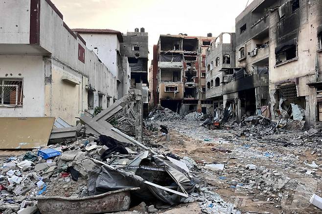 (베이트 라야 AFP=뉴스1) 우동명 기자 = 31일(현지시간) 가자 지구 베이트 라야에 있는 병원에서 이스라엘 군의 포격을 받아 박살 난 건물이 보인다. 2024.11.01