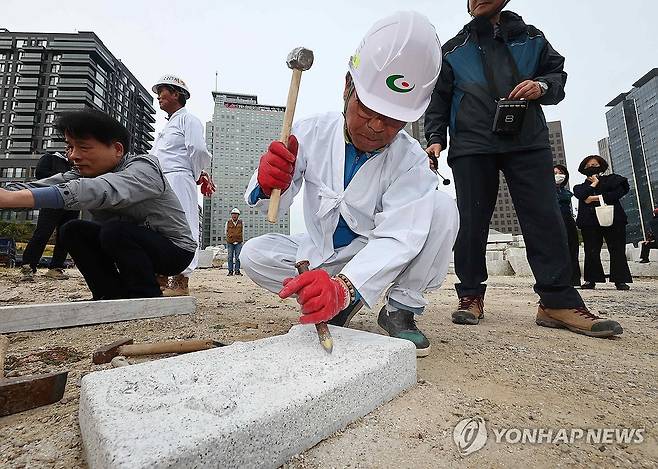 (서울=연합뉴스) 서대연 기자 = 1일 오후 서울 덕수궁 흥덕전에서 열린 2024 서울 무형유산 공개발표회에서 석조각장 임한빈 보유자가 십이지신 중 말의 형상을 조각한 작품을 재현하고 있다. 2024.11.1