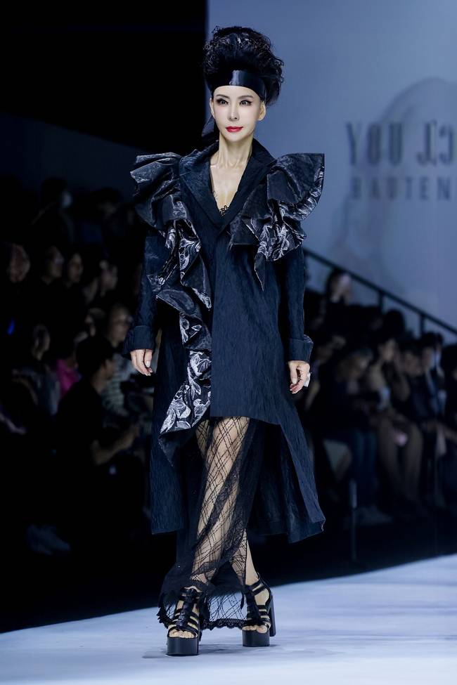 유지영 디자이너 쇼에 선 그는 블랙 프릴 장식이 돋보이는 시크한 룩으로 등장해 프로페셔널한 워킹 실력을 선보이며 쇼장의 분위기를 압도했다. 타고난 프로포션으로 실버와 블랙이 조화롭게 어우러진 드레스도 완벽하게 소화하며 기품 있는 아우라를 발산했다.