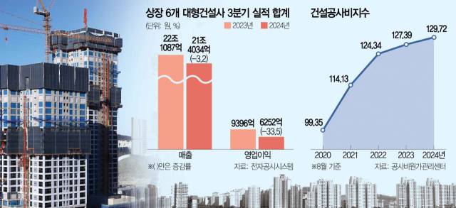 건설 업계의 맏형 격인 현대건설과 삼성물산의 영업이익의 감소가 두드러졌다. 현대건설의 3분기 영업이익은 1143억 원으로 전년 동기 대비 53.1% 감소했고 삼성물산 건설부문의 3분기 영업이익도 전년 동기 대비 22.1% 줄어든 2360억 원으로 잠정 집계됐다. 대우건설 3분기 영업이익은 623억 원으로 67.2% 감소해 주요 건설사 중 감소 폭이 가장 컸다. HDC현대산업개발의 영업이익도 475억 원으로 23.5% 줄었다.