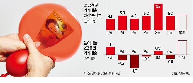 5대 시중은행의 가계대출 증가 폭은 크게 둔화했지만 아직 '대출 빗장'을 걸지 않은 지방은행과 인터넷전문은행, 2금융권을 중심으로 가계대출이 불어난 결과다.