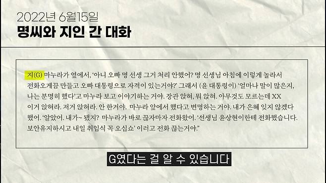 대통령 취임 전부터 명씨는 이미 권력서열 1위가 김건희 여사라는 사실을 겪어서 알고 있었던 겁니다. 세상이 의심한 대로 윤 대통령이 김건희 여사의 꼭두각시였음이 드러나고 있습니다. 이때부터 벌써 대통령의 대명사는 브이(V)가 아니라 지(G)였다는 걸 알 수 있습니다. 장관 인사도 김 여사 뜻대로 이뤄졌음을 시사하는 발언도 있습니다. 이와 관련한 녹음 파일도 민주당이 갖고 있다고 합니다.