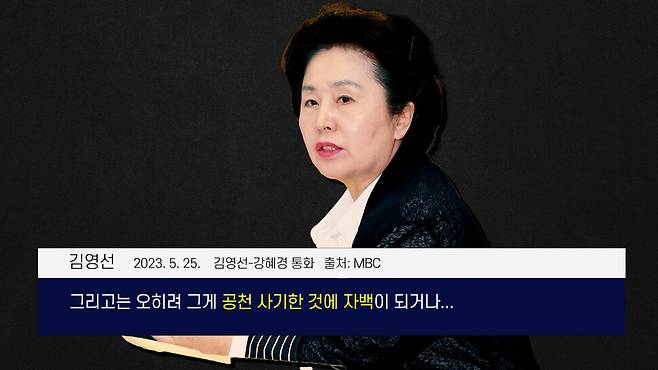 명태균씨와 김영선 전 의원이 지방선거 후보자들로부터 공천헌금을 거둬 대선 여론조사에 썼는데, 이들이 공천을 받지 못하자 김 전 의원이 국가로부터 받은 선거보전금으로 갚았다는 사실을 지난번에 전해 드린 바 있는데요. 선거보전금을 이렇게 쓰면 정치자금법 위반입니다. 그래서 선관위 조사를 받게 되자, 김 전 의원이 자기 이름이 나오면 안 된다고 강혜경씨를 설득하는 내용입니다. 검찰이 윤 대통령 편이니까, “윤 대통령 선거 도왔다 이러면 도움이 될 것 같지만”, 오히려 공천 개입을 자백하는 꼴이라는 얘기입니다.