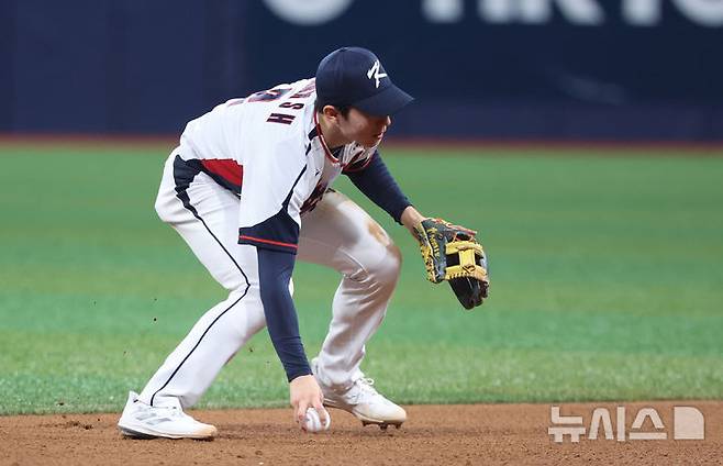 [서울=뉴시스] 김금보 기자 = 1일 서울 구로구 고척스카이돔에서 열린 2024 WBSC 프리미어12 한국 야구대표팀과 쿠바의 1차 평가전, 8회초 2사 주자없는 상황 한국 유격수 박성한이 쿠바 요엘키스 땅볼을 잡아 1루 송구하고 있다. 2024.11.01. kgb@newsis.com