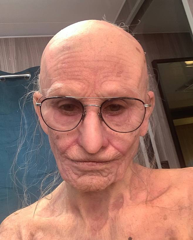 사진 속 데미 무어는 특수분장을 통해 탈모로 휑한 머리와 주름살이 가득한 노인으로 변신한 모습이다.
