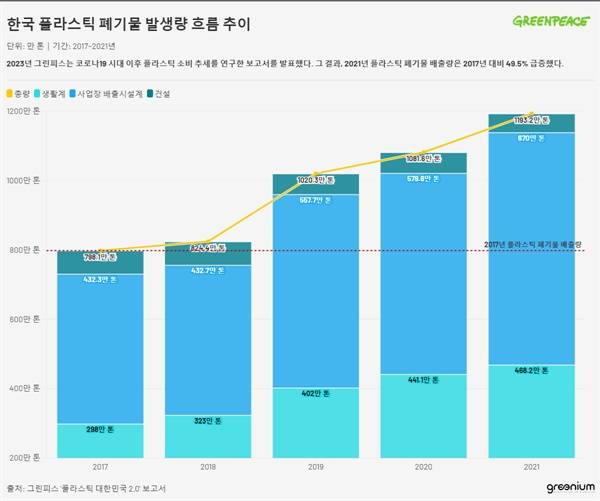 | ▲ 2023년 그린피스는 코로나19 시대 이후 플라스틱 소비 추세를 연구한 보고서를 발표했다. 그 결과, 2021년 플라스틱 폐기물 배출량은 2017년 대비 49.5% 급증했다. |