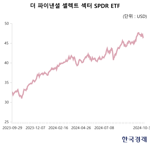 이 덕에 관련 상장지수펀드(ETF)도 좋은 주가 흐름을 보이고 있습니다. 은행을 비롯해 각종 미국 금융주를 모아 놓은 '더 파이낸셜 셀렉트 섹터 SPDR ETF(XLF)'는 연초 이후 25.45% 상승했고, 올 하반기 들어서는 13.86% 올랐습니다. '인베스코 KBW 뱅크 ETF(KBWB)'는 연초 이후 29.72%, 올 하반기에 17.36% 상승했습니다.