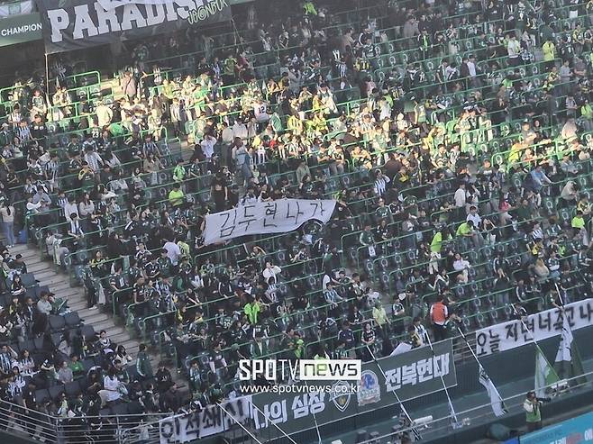 경기 종료 후 전북 팬들은 "김두현 나가"걸개를 들어 올렸다.