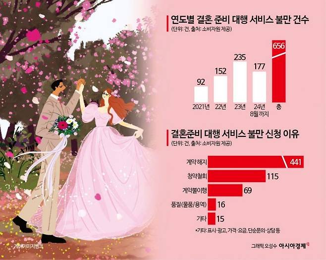 이에 따른 계약 해지나 위약금에 대한 소비자들의 불만도 높아지고 있다. 소비자원에 따르면 결혼 준비 대행 서비스 관련 피해구제 신청은 2021년 92건에 이어 2022년 152건, 작년 235건으로 매년 늘어나고 있다. 올해 8월까지만 벌써 177건에 달한다. 2021년부터 올해 8월까지 결혼 준비 대행 서비스에 대한 불만 신고 사유 656건 중 계약 해지 및 위약금에 대한 내용은 441건으로 대다수를 차지한다. 이어 청약 철회 115건, 계약 불이행 건수는 69건이다.