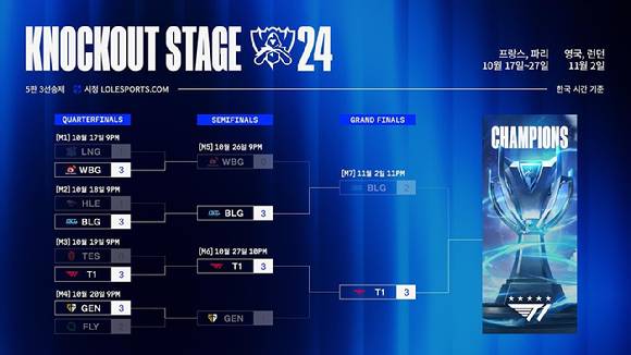 라이엇게임즈는 LCK 대표 T1이 2일 영국 런던에 위치한 O2 아레나에서 열린 2024 리그 오브 레전드 월드 챔피언십 결승전에서 LPL 1번 시드인 빌리빌리 게이밍을 세트 스코어 3대2로 제압하고 소환사의 컵을 들어 올렸다고 밝혔다.