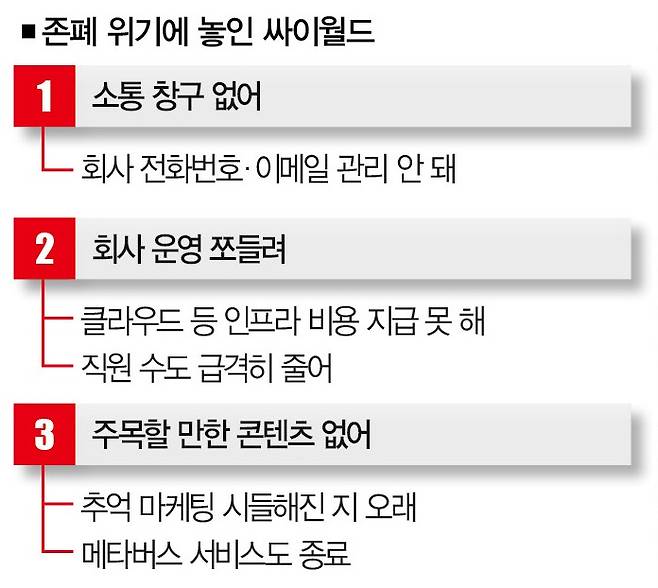 ■ 시그널➋ 쪼들리는 회사 = 싸이월드의 위기를 알리는 신호음은 또 있습니다. IT업계에 따르면 싸이월드의 인프라 서비스 운영을 맡고 있는 카카오엔터프라이즈는 지난해 7월부터 싸이월드제트로부터 운영 비용을 받지 못한 것으로 알려져 있습니다. 클라우드 서비스를 제공해 싸이월드의 이용자 데이터를 관리하는 GS네오텍도 마찬가지로 대금을 받지 못했습니다. 카카오엔터프라이즈 관계자는 "데이터 관리 비용이 매달 수억원씩 쌓인다"면서 "요금 정산에 싸이월드제트는 묵묵부답으로 일관하고 있다"고 말했습니다.