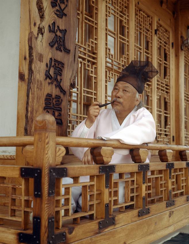 | ▲ 운보 김기창 화백. 사진은 툇마루에 앉아 곰방대로 담배를 피우는 김기창 화백. 1984.5.22 |