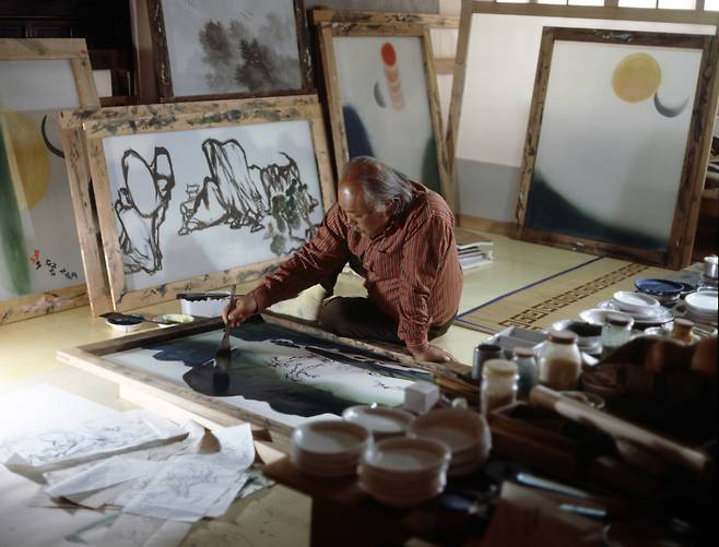 | ▲ 운보 김기창 화백. 사진은 화실에서 작품을 그리고 있는 김기창 화백. 1984.5.22 |