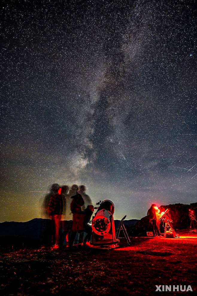 [스코페=신화/뉴시스] 2일(현지시각) 북마케도니아 스코페 인근에서 사람들이 은하수와 그 주변을 지나는 혜성 'C/2023 A3'(쯔진산-아틀라스 혜성)를 관측하고 있다. 2024.11.03.