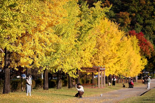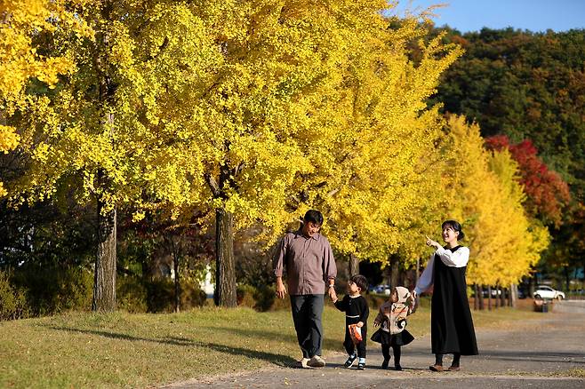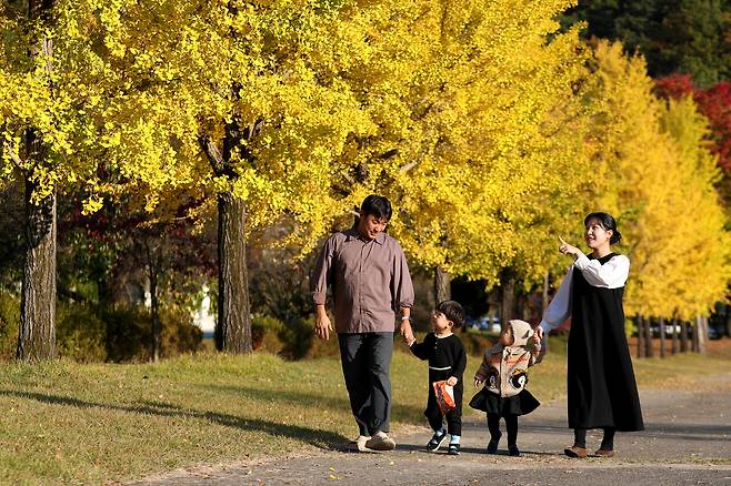 긴 늦더위와 변덕스러운 가을 날씨가 이어지면서 늑장 단풍이 시작된 가운데, 3일 오후 대전 유성구 현충원을 찾은 가족들이 은행나무 아래를 거닐며 가을을 만끽하고 있다.