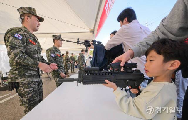 3일 오후 김포함상공원에서 열린 '2024 김포 해병대 문화축제'를 찾은 시민들이 보병장비를 체험해보고 있다.