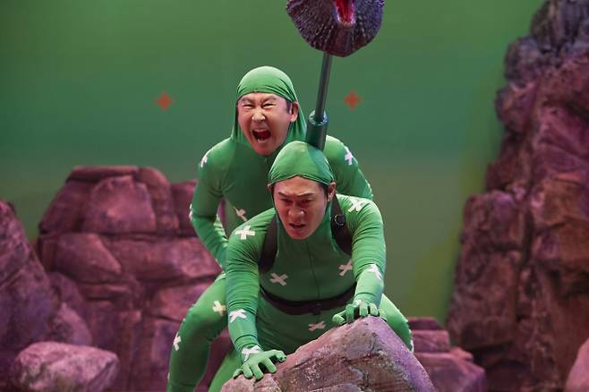 이어 ‘배우’ 진선규 자체로 등장한 코너에서는 쫄쫄이를 입고 그린 매트 위를 누비는 괴수를 연기하며 상대 배역 신동엽과 역대급 아찔한 19금 코미디를 선보여 무대를 뒤집어 놓았다.