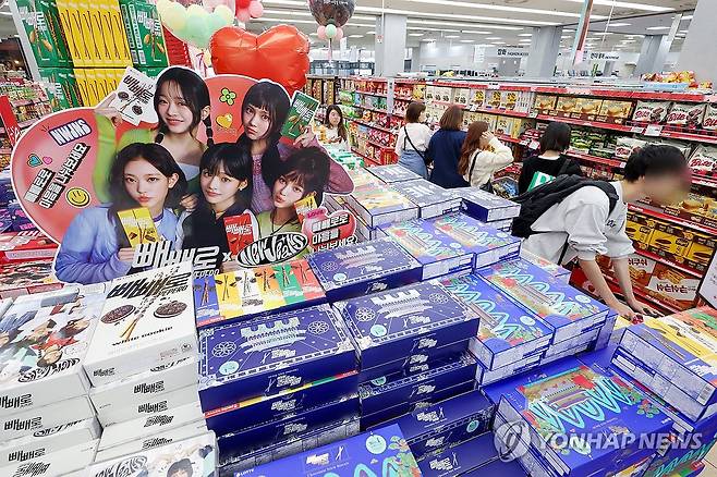 (서울=연합뉴스) 김도훈 기자 = 빼빼로데이(11일)를 1주일 가량가량 앞둔 3일 오전 서울 용산구의 한 대형마트에 걸그룹 뉴진스를 모델로 한 과자들이 진열돼 있다. 2024.11.3