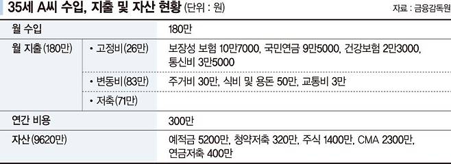 A. 35세 A씨 월 수입은 180만원(실업급여)이다. 연간 비정기 수입은 따로 없다. 월 지출은 용처가 파악되지 않는 사항 없이 그대로 180만원이다. 고정비는 26만원이다. 보장성 보험료(10만7000원), 국민연금(9만5000원), 건강보험(2만3000원), 통신비(3만5000원) 등이다. 변동비는 부모님께 내는 주거비(30만원), 식비·용돈(50만원), 교통비(3만원) 등을 합쳐 8만원이다. 저축은 71만원씩 하고 있다. 연간비용으로는 300만원이 나간다.