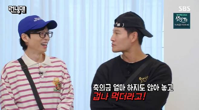 유재석은 "어제 (조)세호 결혼식에서도 종국이가 (조)나단을 앉혀놓더니 얘기를 많이 하더라"라고 떠올렸고 김종국은 "축의금을 얼마 하지 않고 겁나 처먹더라고. 얼마 냈는지는 말할 수 없다"라고 거침없이 말을 이어갔다.