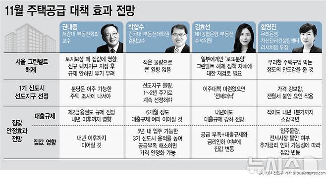4일 뉴시스가 국내 부동산 전문가 4인을 대상으로 11월 주택공급 대책의 부동산시장 영향을 조사한 결과 서울 그린벨트 해제와 1기 신도시 선도지구 선정 모두 중장기적으로는 공급확대에 대한 기대감이 높아질 것이라는 데 무게가 실렸다.