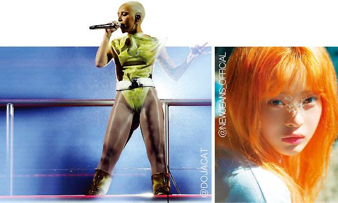 이미 K-팝 걸 그룹 사이에서 Y3K 트렌드는 현재진행형이다. 인기 걸 그룹의 뮤직비디오와 무대 의상에서 일명 '쇠 맛’ 감성의 Y3K 패션을 발견할 수 있다. 걸 그룹 에스파는 Y3K의 대표 주자로 손꼽힌다. 에스파는 데뷔 이래로 줄곧 가상 아바타와 함께하는 독특한 세계관을 통해 사이버 펑크와 미래지향적 패션을 강조해왔다. 지난 5월 발매된 정규앨범 1집 타이틀곡 'Supernova’ 활동에서도 우주 분위기의 콘셉트 포토와 메탈릭한 의상, 볼드 주얼리를 통해 AI와 가상의 세계가 결합된 세계관을 표현했다. 특히 멤버 윈터의 필오프팩을 활용한 홀로그램 메이크업은 유약을 발라 구운 듯한 남다른 광채감을 선사하며 화제가 됐다. 그의 메이크업을 담당한 조은비 아티스트는 "사랑스러운 외계인 느낌이 나도록 얼굴 전체에 필오프 마스크팩을 덮고 그 위에 메이크업을 진행했다"고 밝힌 바 있다. 10월 21일에 발매한 다섯 번째 미니앨범 'Whiplash’는 혀끝에 금속을 가져다댄 듯 한층 짜릿한 쇠 맛을 선사한다. 에스파와 양극단에 서 있는 걸 그룹 뉴진스 역시 Y2K 일색인 룩에 실버 메탈 주얼리를 슬쩍 더해 복고적이면서도 어딘지 미래적인 메시지를 전달한다. 해외에서는 가수 도자 캣이 Y3K 스타일의 대중화에 크게 기여하고 있다. 디지털 아트에서 툭 튀어나온 듯 과감하고 기발한 사이버 펑크 룩은 그만의 미래적이면서도 독창적인 감각을 여실히 보여준다. 싱어송라이터 로살리아 역시 'MOTOMAMI’ 앨범에서 강인한 메탈 소재 보디슈트와 헤어피스로 Y3K 스타일을 이끌었다.