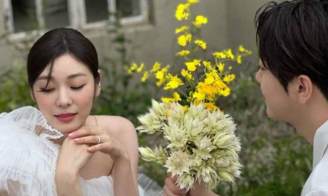 최근 김연아는 자신의 계정에 "두 번째 결기(결혼기념일)"라는 멘트와 함께 웨딩드레스를 입고 있는 사진 여러 장을 공개했다. 그의 곁에는 슈트를 입고 있는 고우림이 자리하고 있어 훈훈함을 자아냈다.