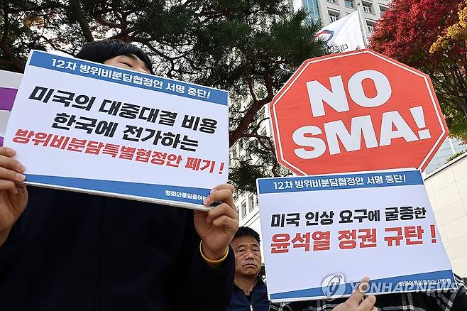 (서울=연합뉴스) 윤동진 기자 = 4일 오전 서울 외교부 앞에서 평화와 통일을 여는 사람들 주최로 12차 방위비분담특별협정안 서명 중단 촉구 기자회견이 진행되고 있다. 2024.11.4