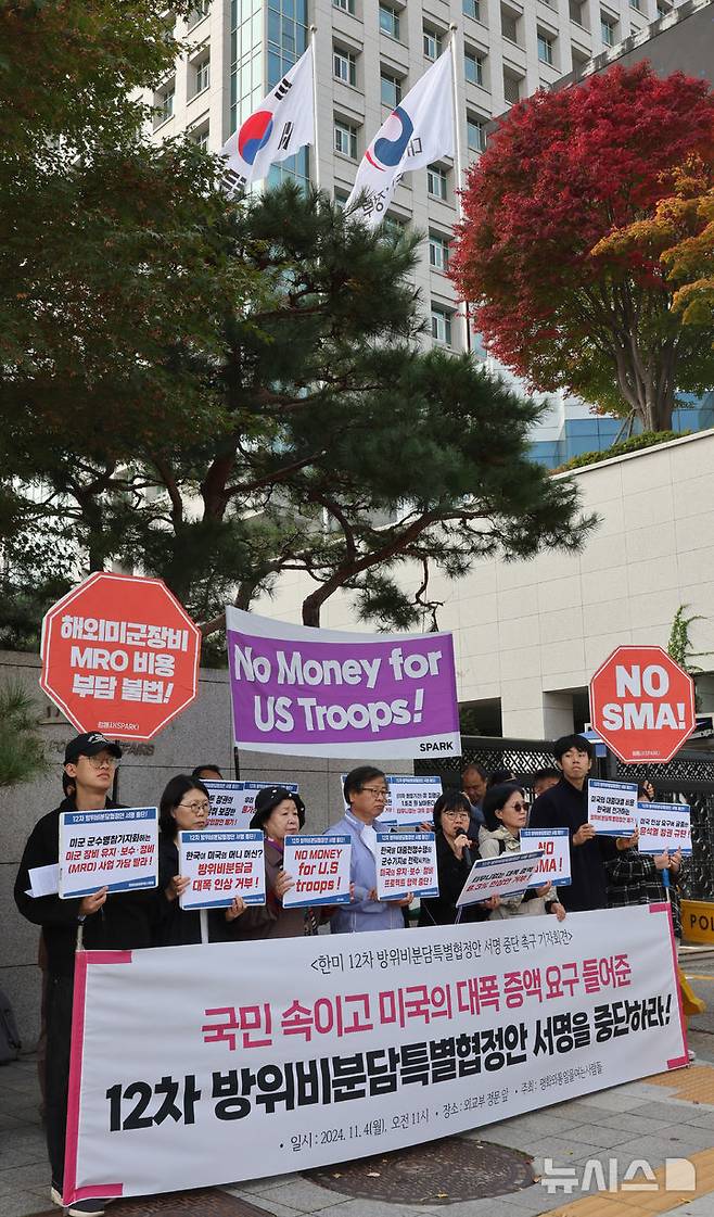 [서울=뉴시스] 김금보 기자 = 평화와통일을여는사람들 활동가들이 4일 오전 서울 종로구 외교부 앞에서 '한미 12차 방위비분담특별협정안 서명 중단 촉구 기자회견'을 열고 구호를 외치고 있다. 2024.11.04. kgb@newsis.com