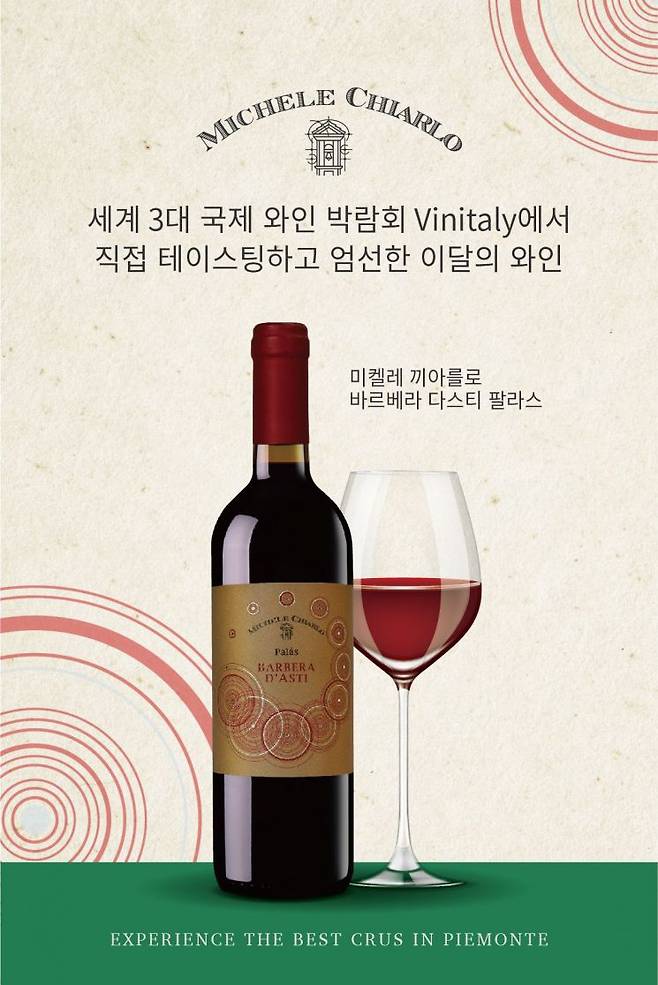 이번에 출시한 신제품 '미켈레 끼아를로 바르베라 다스티 팔라스(Michele Chiarlo Barbera D’Asti)'는 바르베라 100%로 라즈베리, 크렌베리 등 붉은 과실의 풍미가 지배적이고 우아하면서도 풍성한 아로마가 인상적인 와인이다. 특히 부드러운 타닌과 바르베라에서 느껴지는 경쾌한 산도로 어떠한 음식과도 좋은 페어링을 만들어준다. 미켈레 끼아를로는 피에몬테 지역의 대표 와이너리 중 한 곳으로 이탈리아 프리미엄 와인 브랜드만 가입할 수 있는 '그란디 마르키(Grandi Marchi)'에 속해있다.