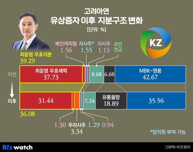 마지막 수는 공개매수 직후 발표된 증자다. 지난달 30일 고려아연은 373만2650주(20%) 규모의 일반공모 증자를 발표했다. 예상 주당 발행가는 67만원으로, 고려아연의 공개매수(89만원)보다 낮은 가격에 신주를 발행하면서 시장은 충격에 빠졌다. 고려아연은 우리사주조합을 제외한 모든 청약자의 모집주식을 3% 내로 배정하는 제한을 뒀다. 특수관계인으로 묶인 영풍·MBK 연합에 최대 3%만 신주만 배정해, 지분 대결에서 역전하겠다는 묘수를 짜낸 것이다.