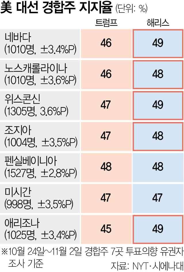 NYT와 시에나대가 이날 발표한 여론조사에서 해리스는 7개 경합주 가운데 네바다·노스캐롤라이나·위스콘신·조지아·애리조나 등 5곳에서 트럼프보다 1~3%포인트 앞서고 있다. 다만 두 후보 간 격차가 오차 범위 내에 있어 승부를 예단하기는 어려운 것으로 평가된다. 또 영국 여론조사 전문 업체 포컬데이터가 지난 한 달간 미국 유권자 3만 1000여 명을 상대로 ‘다중 레벨 회귀 분석 및 사후 계층화(MRP)’ 기법을 사용해 설문·분석한 결과에서는 ‘해리스의 승리’가 예측됐다. 이와 관련해 선거 막판 ‘히든 해리스’가 힘을 발휘할지에도 관심이 모인다. 경합주를 중심으로 여자 화장실과 미용실 등에서 여성들에게 주체적으로 투표하도록 독려하는 메모지가 번지고 있다고 워싱턴포스트(WP)가 이날 전했다. 메모지에 적힌 글은 조금씩 다르지만 “당신이 누구를 찍었는지 아무도 모른다”는 내용이 담긴 것으로 알려졌다. 공화당의 백인 기혼 여성 등을 상대로 소신껏 해리스를 찍으라는 선거운동이 은밀하게 진행되고 있는 것이다.