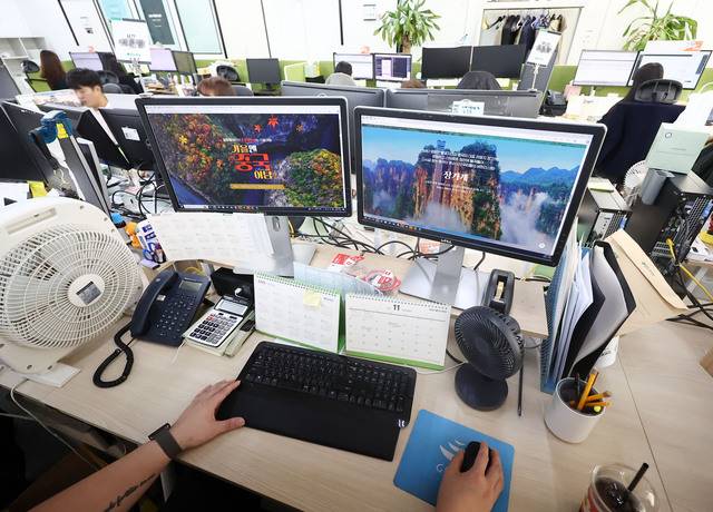 중국의 무비자 조치로 중국 여행 활성화에 대한 기대감이 커지는 가운데 4일 서울 중구 모두투어 본사 중국사업부에서 직원들이 업무를 보고 있다. 연합뉴스