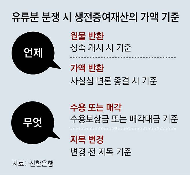 원칙은 ‘상속 개시 시’가 기준이다. 증여받은 재산이 금전일 경우에는 그 금액을 상속 개시 당시의 화폐 가치로 환산한다. 이때 화폐 가치의 환산은 증여와 상속 개시 사이의 물가변동률을 반영하는 방법으로 산정한다. 유류분 반환은 증여받은 재산 자체를 원물 반환하는 것이 원칙이다. 다만 원물 반환이 불가능하거나 현저히 곤란한 경우 또는 유류분 권리자와 반환 의무자 사이에 합의가 이뤄진 경우에는 가액 반환도 가능하다. 이때 증여재산의 가액을 ‘사실심 변론 종결 시’를 기준으로 한다. 사실심이란 1심과 2심을, 변론 종결 시는 판결 선고 전 마지막 변론기일을 뜻한다.