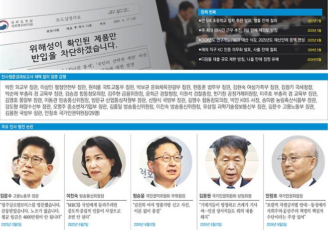 윤 대통령은 재임 초기 인사의 기준을 “오로지 능력”이라고 강조했다. 대통령실이 후보자들의 각종 논란을 인지하고도 지명을 강행했다가 여론 비판에 후퇴하는 사례가 잇따랐다.