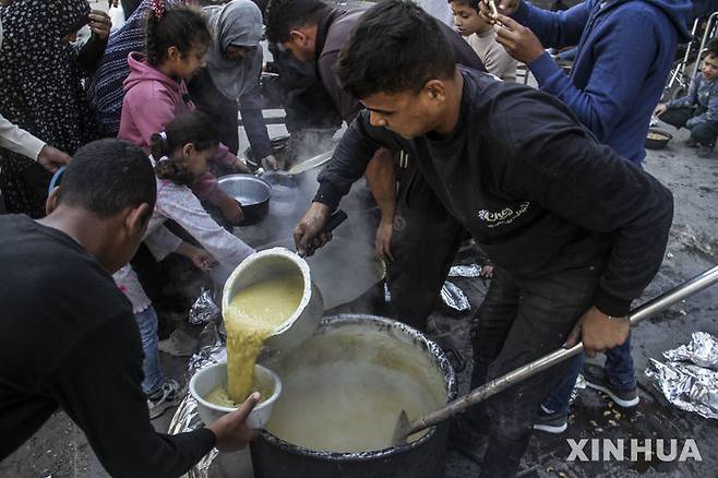 [가자시티=신화/뉴시스] 4일(현지시각) 가자지구 가자시티에서 어린이를 비롯한 팔레스타인 주민들이 식량 배급을 받고 있다. 세계보건기구(WHO), 유엔아동기금(UNICEF), 국제이주기구(IOM), 세계식량계획(WFP) 등 15개 유엔 기구와 구호 단체 수장은 공동 성명에 서명하고 "가자지구 북부 전역에 있는 팔레스타인 주민들은 질병·기아·폭력으로 목숨을 잃을 처지에 놓여 있다"라고 밝혔다. 2024.11.05.