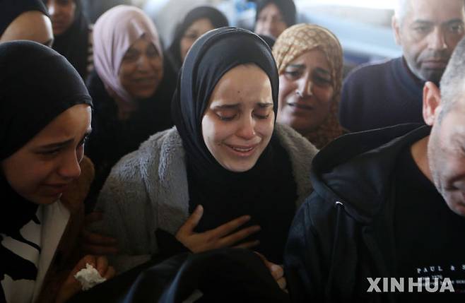 [헤브론=신화/뉴시스] 4일(현지시각) 서안지구 헤브론에서 한 여성이 팔레스타인 소년 나지 알바바의 장례식 중 흐느끼고 있다. 팔레스타인 적신월사(PRCS)는 헤브론 북부 할훌 마을에서 한 팔레스타인 청소년이 이스라엘군의 총격으로 숨졌다고 전했다. 2024.11.05.