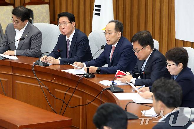 (서울=뉴스1) 이광호 기자 = 추경호 국민의힘 원내대표가 5일 오전 서울 여의도 국회에서 열린 원내대책회의에서 모두발언을 하고 있다. 2024.11.5/뉴스1