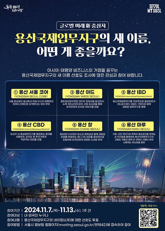 이와 관련 서울시는 오는 7~13일 일주일 간 용산국제업무지구를 직관적으로 표현할 온라인 선호도 조사를 진행한다. 참여를 원하는 사람은 서울시 엠보팅 누리집(mvoting.seoul.go.kr/89842)에서 선호하는 브랜드 1개(1인 1회)에 투표하면 된다. 선정 사유를 기재할 수도 있다.