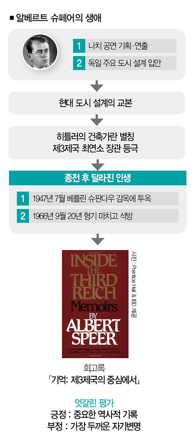 출간하자마자 베스트셀러에 오른 슈페어의 저서는 제3제국의 실상과 히틀러의 행적을 담은 중요한 역사 기록이 됐다. 히틀러 암살 작전의 정황을 다룬 '작전명 발키리(브라이언 싱어 감독·2008년)'와 베를린 공방전과 히틀러의 최후를 조명한 '몰락(올리버 히르슈비겔 감독·2004년)'은 모두 슈페어의 회고록에 기록된 사실을 토대로 제작된 영화다.